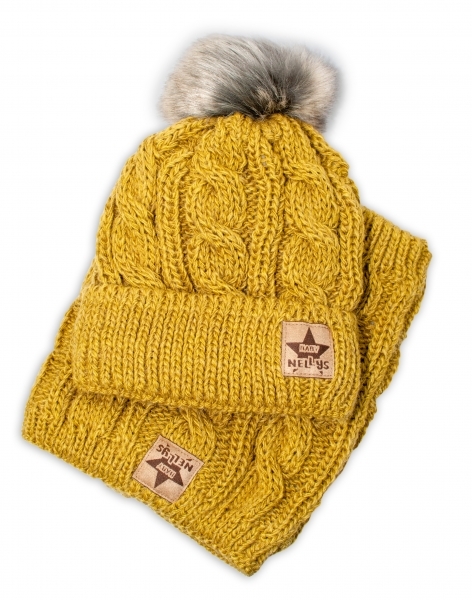 BABY NELLYS Zimní pletená čepice s bambulí + komínek, hořčice, 52-56cm; 104-116 (4-6r)