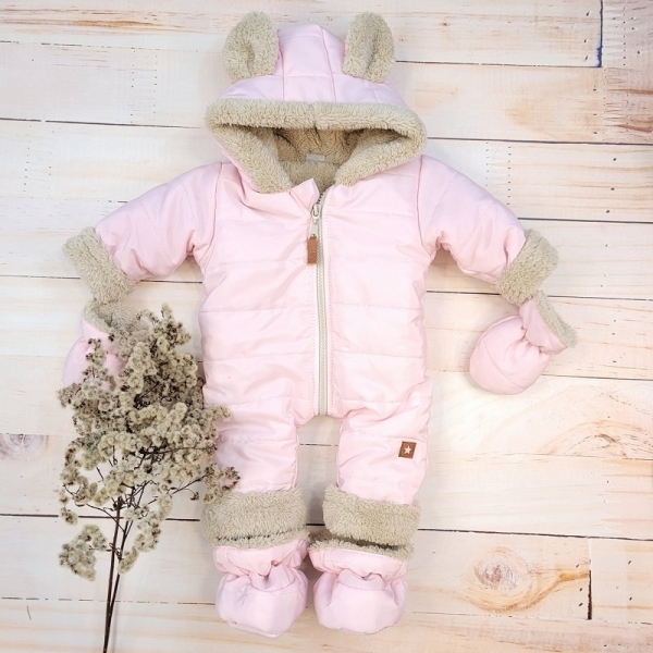 Zimní prošívaná kombinéza s kožíškem a kapucí + rukavičky + botičky, Z&Z - růžová; 56 (1-2m)