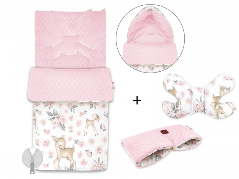 Mega 3-dílná sada fusak + polštářek + rukávník, Srnka a Růže - růžový, Baby Nellys