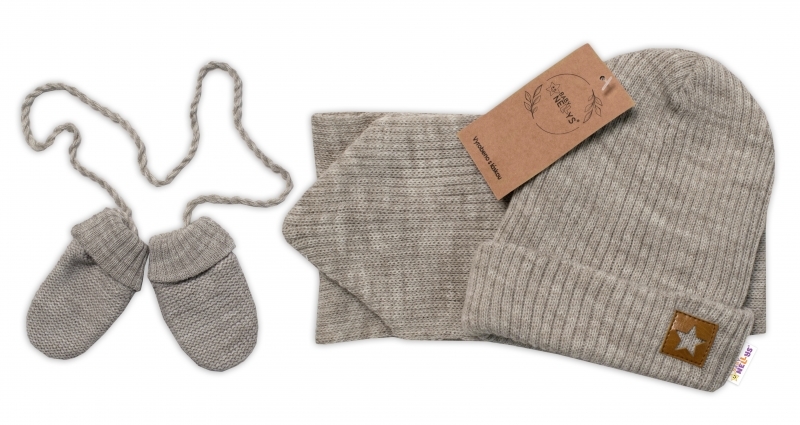 Baby Nellys Pletená čepice s šálou a rukavičky 3v1, STAR - béžová, 68/74; 68/74 (6-9m)