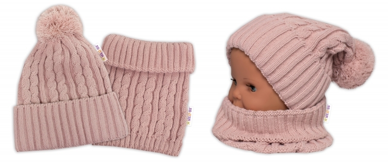 Zimní čepice s bambulí + komínek Baby Nellys - pudrová, růžová, vel. 48-52cm; 98-104 (2-4r)