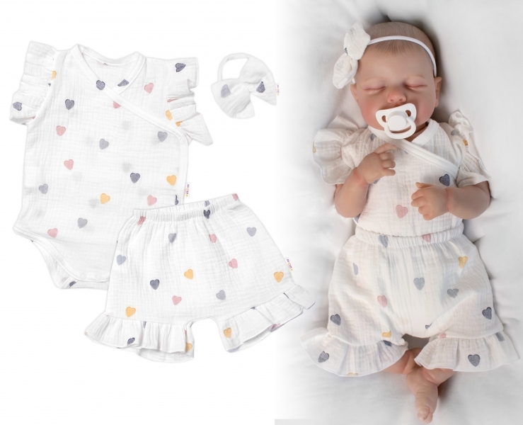 Zavinovací body, kraťasky + čelenka, mušelín, Srdíčko, Baby Nellys, smetanové, vel. 74; 74 (6-9m)