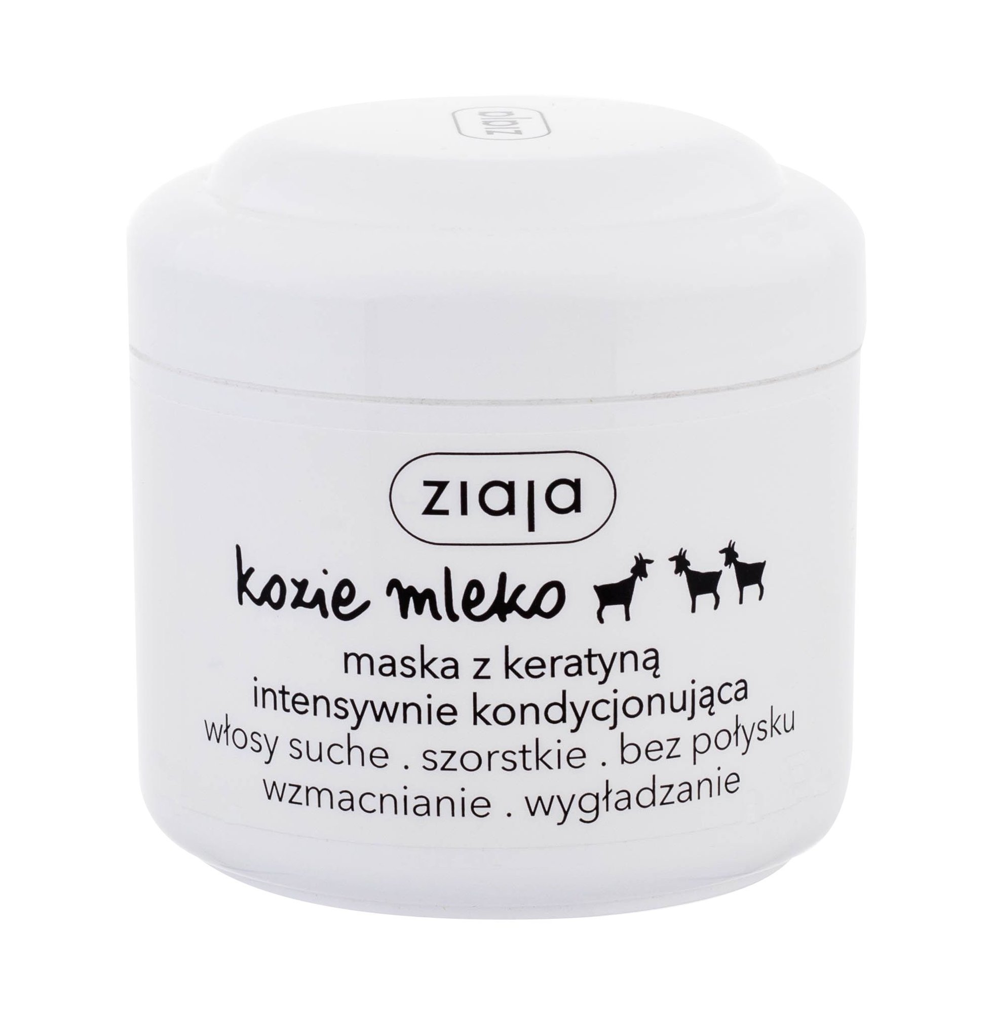 Maska do włosów z keratyną **Ziaja Goat´s Milk** Maska do włosów regeneruje uszkodzone włókno włosa dzięki składowi wzbogaconemu o keratynę. Wygładza włókno włosa i nadaje mu blask oraz miękkość. Skuteczny kondycjoner Polyquaternium-70 zawarty w masce ułatwia rozczesywanie. Lekka formuła nie obciąża włosów. Dzięki masce do włosów Goat´s Milk Twoje włosy będą piękne i zadbane. **Sposób użycia:** Nakładać na włosy osuszone ręcznikiem. Pozostawić na 3 - 5 minut. Dokładnie spłukać. W celu regeneracji rozdwojonych końcówek nałożyć na końcówki włosów. Nie spłukiwać.