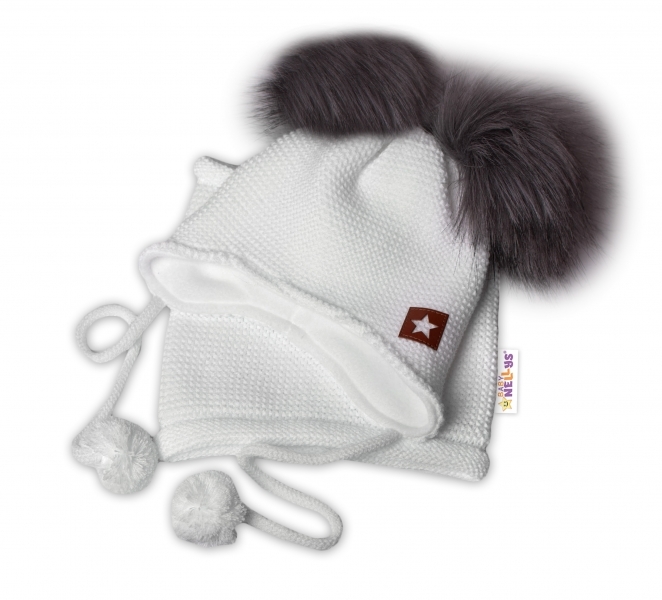 Zimní čepice s fleecem a chlupáčkové bambulky Star + komínek - bílá, BABY NELLYS; 68-86 (6-18m)