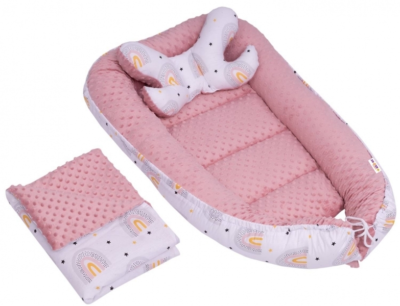 Baby Nellys Sada komplet oboustr. hnízdečko s minky Rainbow, bílá/pudrová