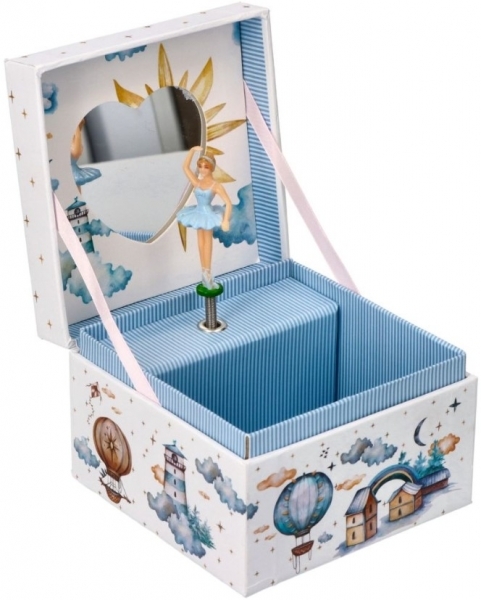 Szkatułka muzyczna z motywem krainy snów - po jej bokach znajdują się chmury, księżyc i latarnia. Dodatkiem jest mała wioska i sterowiec z balonem z błyszczącymi gwiazdkami widocznymi w tle. Księżyc ozdobiony iskrzącymi się zielononiebieskimi brokatowymi drobinkami nadaje szkatułce delikatny, ale niezbyt przesadny blask. W głównej roli piękna, błyszcząca baletnica we wszystkich kolorach tęczy.