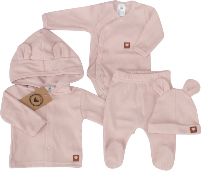 Sada do porodnice 4D, žebrovaná, body, polodupačky, kabátek a čepička, pudrová; 50 (0-1m)