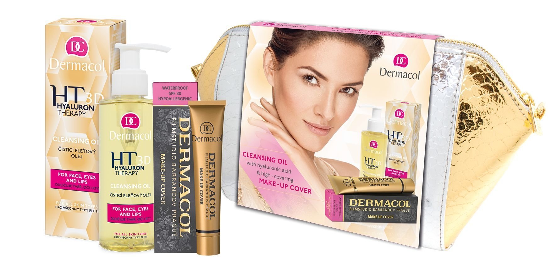 Dermacol 3D Hyaluron Therapy čisticí pleťový olej 150 ml + make-up Cover SPF30 30 g 210 + kosmetická taštička