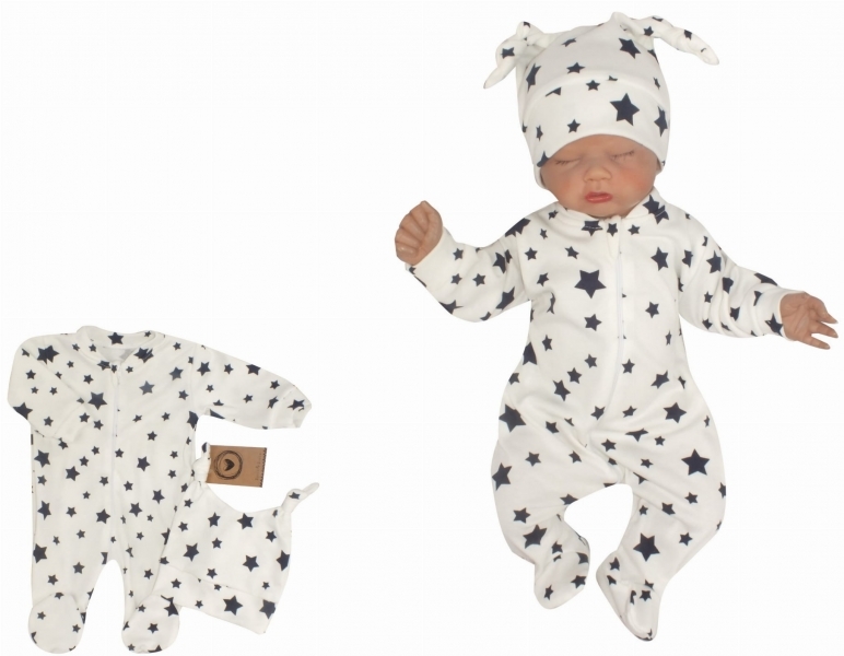 Z&Z 2-dílná soupravička overálek se šlapkama + čepička, Hvězdy - bílá, vel. 74; 74 (6-9m)