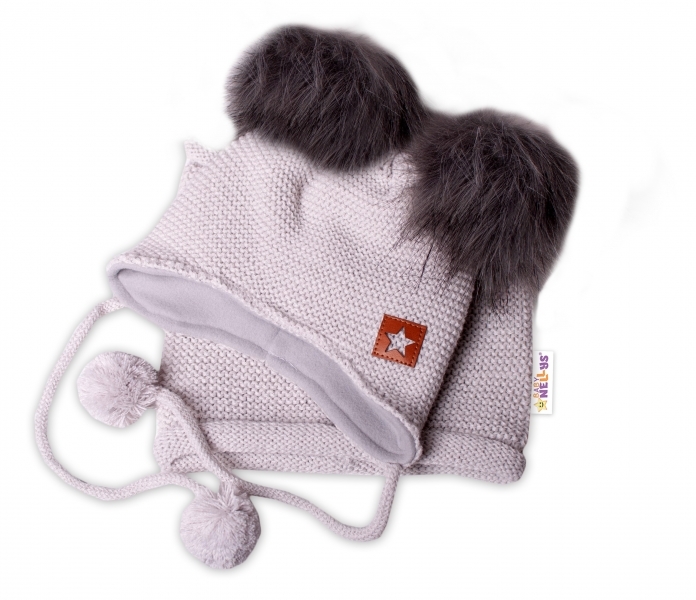 Zimní čepice s fleecem a chlupáčkové bambulky Star + komínek - šedá, BABY NELLYS; 68-86 (6-18m)