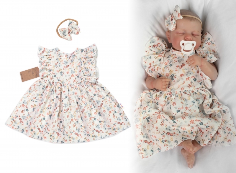 Mušelínové šatičky + čelenka 2-dílná sada Luční kvítky, Baby Nellys, smetanové, vel. 98; 98 (2-3r)