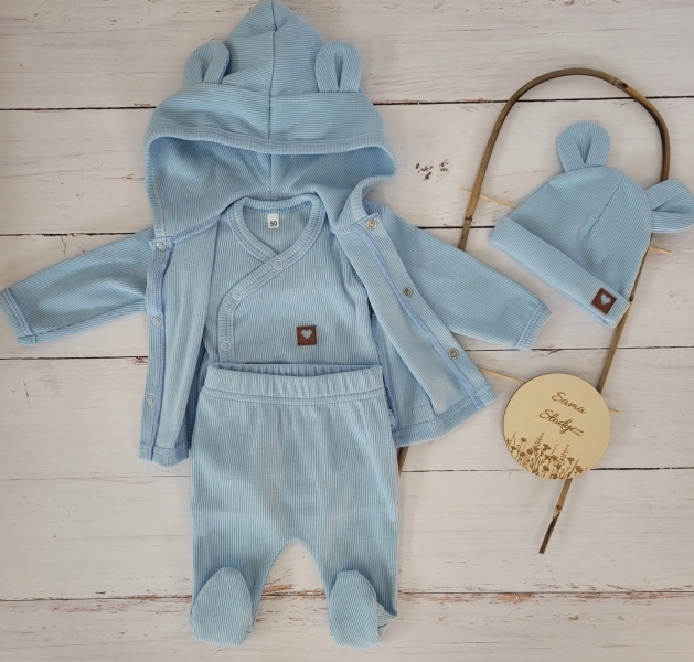 Sada do porodnice 4D, žebrovaná, body, polodupačky, kabátek a čepička, modrá, vel. 62; 62 (2-3m)