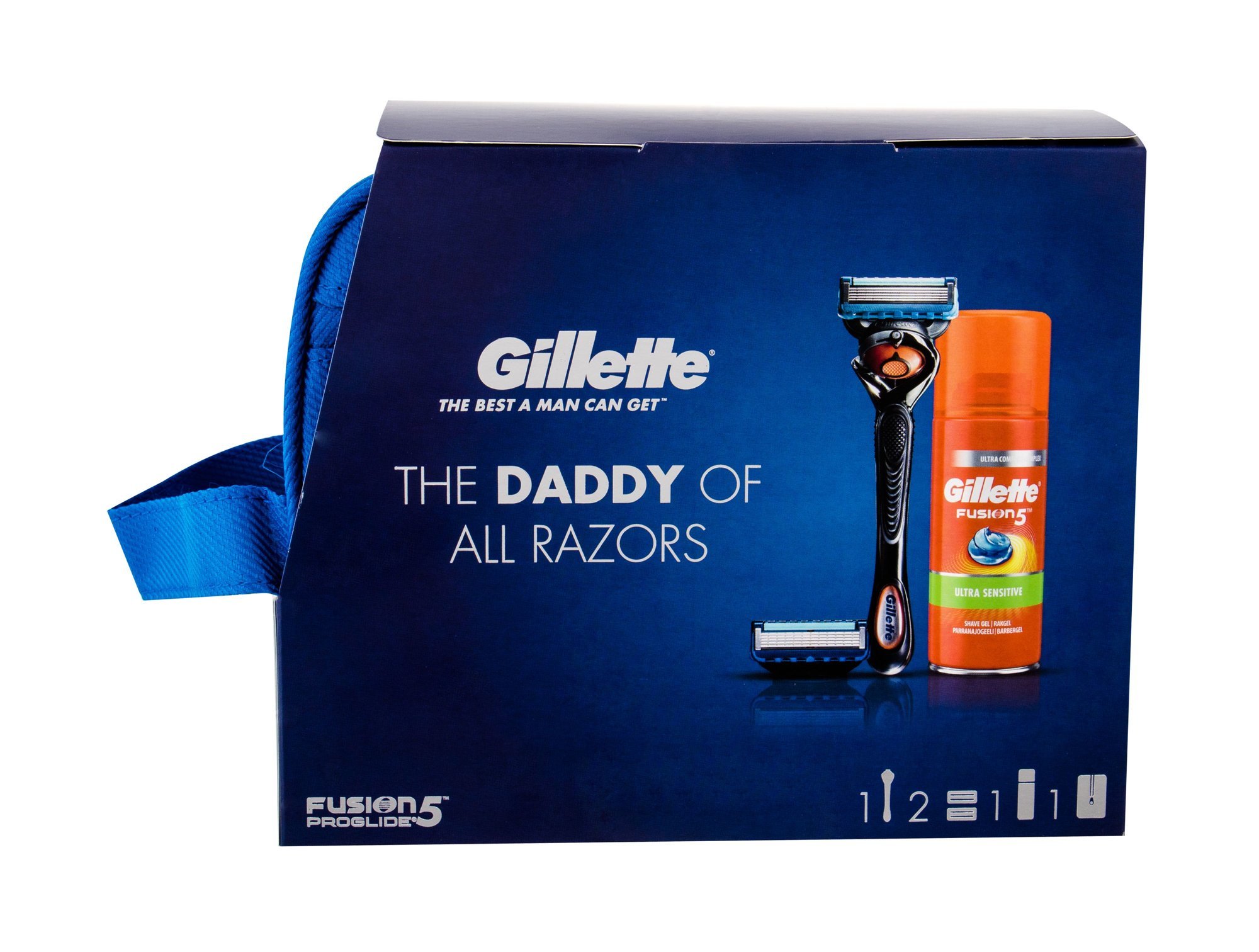 Gillette Fusion Proglide holicí strojek s jednou hlavicí 1 ks + náhradní hlavice 2 ks + gel na holení Fusion5 Ultra Sensitive 75 ml + kosmetická taška