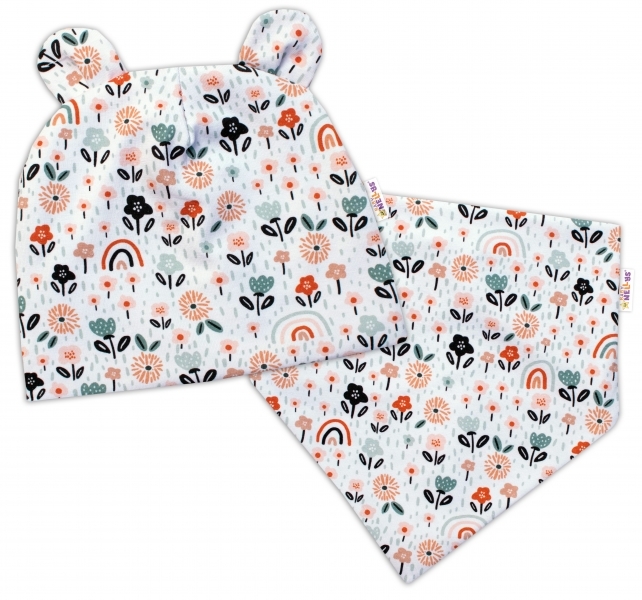 Baby Nellys Dvouvrstvá čepice s oušky + šátek Palouček, smetanová; 62-74 (3-9m)
