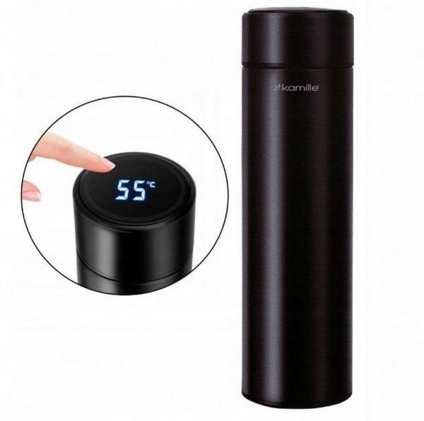 Termohrnek KAMILLE - v autě nepostradatelný, ideální pro práci nebo delší výlety, v chladnějších i teplých dnech. Termoska byla vyrobena z nejkvalitnějších izolačních materiálů, díky čemuž udržuje teplotu obsahu po dlouhou dobu, což můžete zkontrolovat jediným pohybem na dotykovém čitelném LED displeji. Dokonale udržuje teplo nebo chlad až 8 hodin a je 100% nepropustný. Jednoduché a pohodlné použití, nárazuvzdorné.