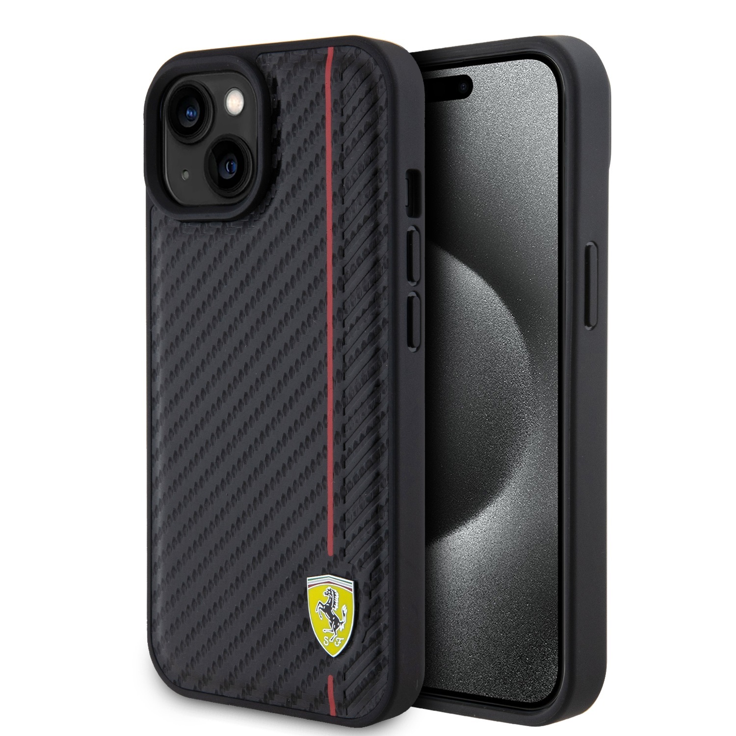Ferrari PU Leather Carbon Vertical Red Line Zadní Kryt pro iPhone 15 Black