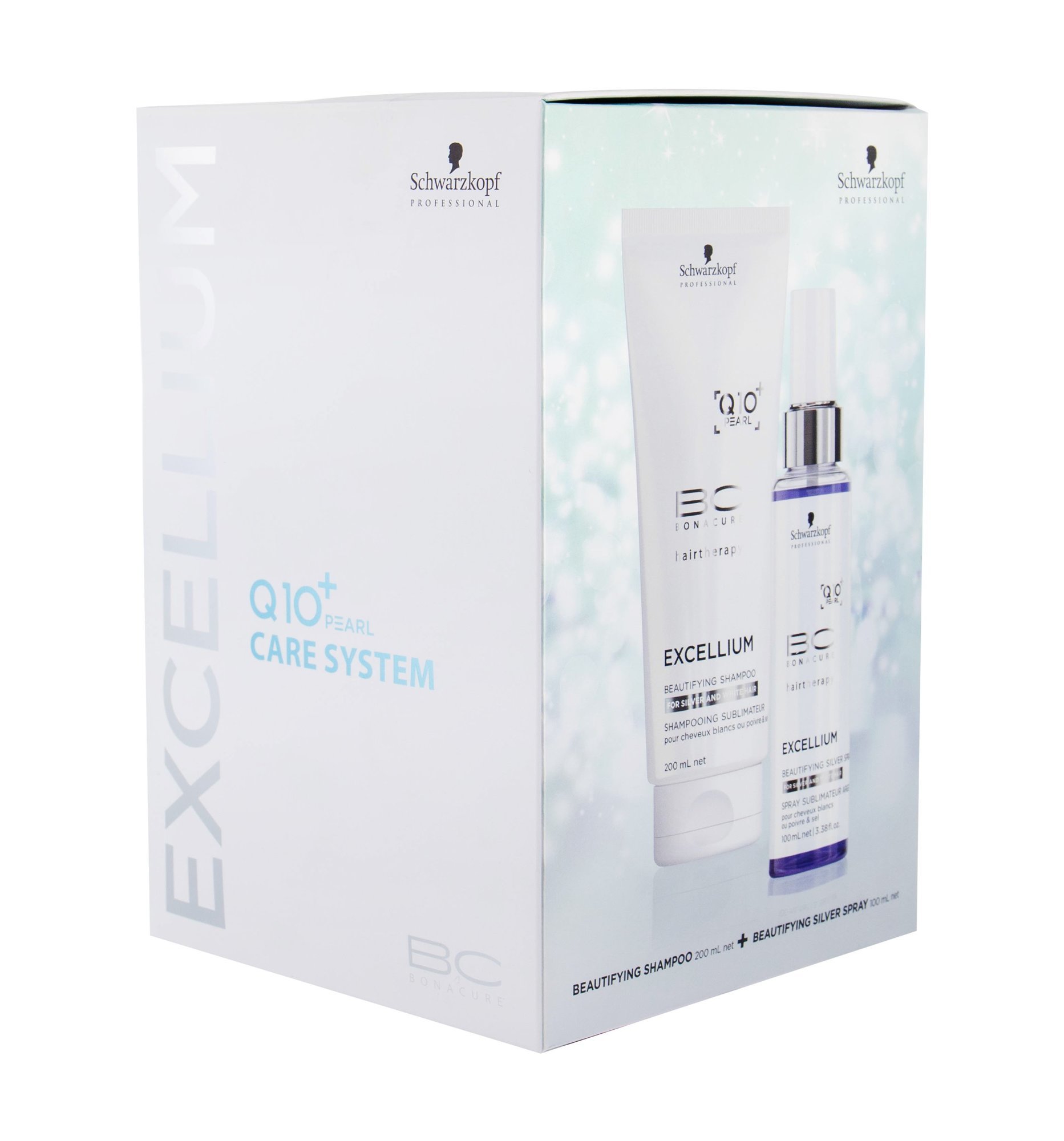 Dárková sada pro šedé vlasy Schwarzkopf BC Bonacure Excellium Beautifying.Složení kazety:Šampon Schwarzkopf BC Bonacure Excellium Beautifying 200 ml.Šampon Schwarzkopf BC Bonacure Excellium Beautifying šetrně čistí stříbrné a bílé vlasy. Složení obsahuje extrakt z černých perel a Q10, které...