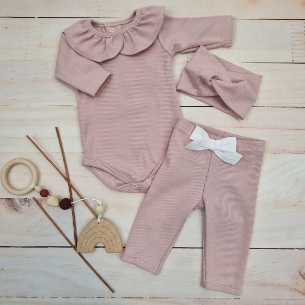 Žebrované body s límečkem, legíny a čelenka, 3D, bavlna, pudrová, vel. 74