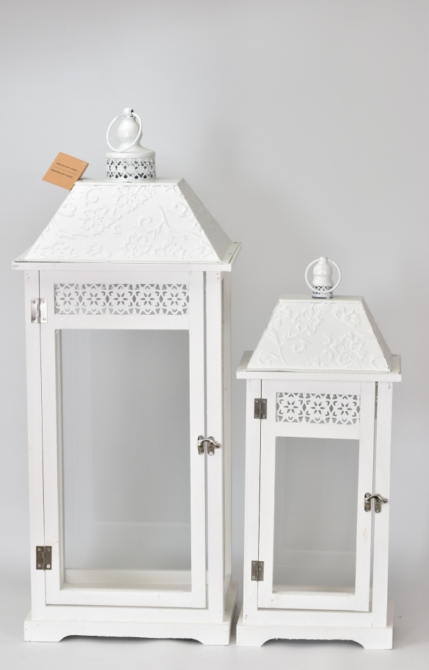 Dřevěná lucerna bílá s patinou, sada 2 ks