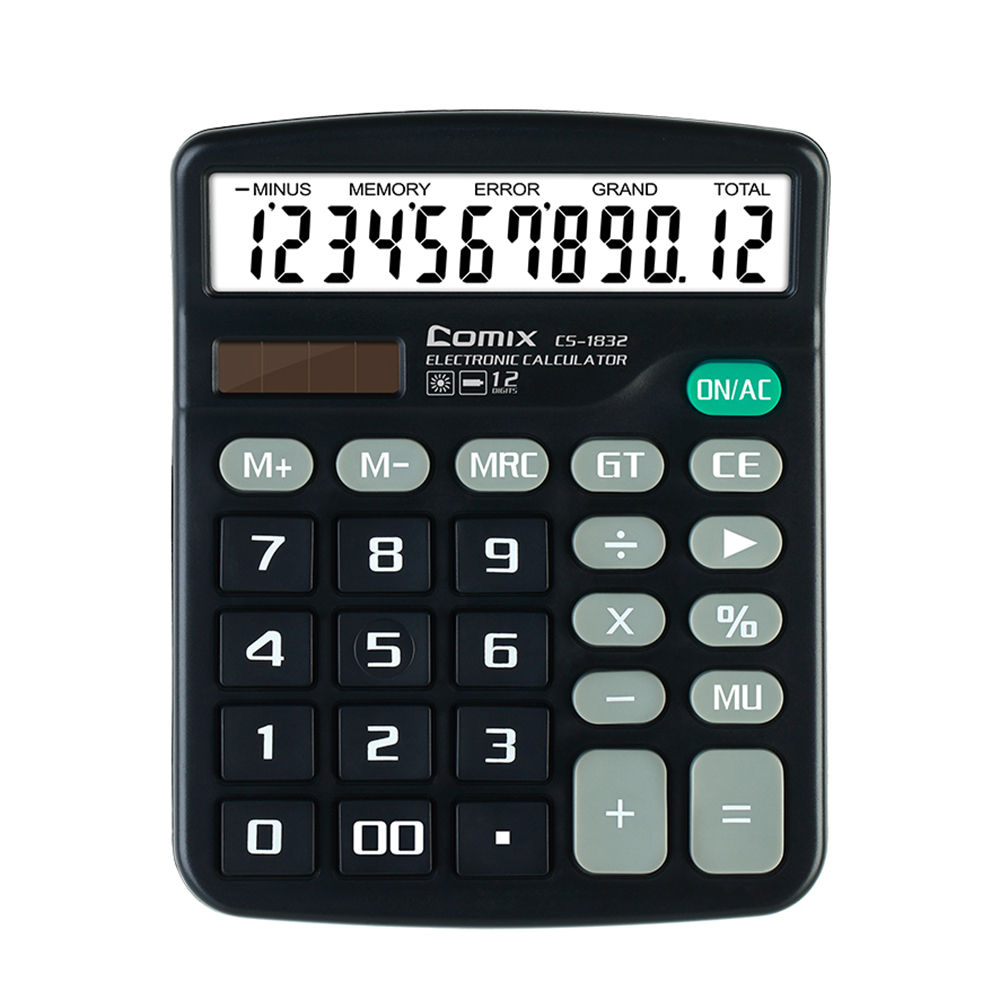 Kalkulator Office Comix CS-1832 to kalkulator średniej wielkości. Posiada duży i doskonale czytelny wyświetlacz. Wprowadzanie danych ułatwia przejrzysta klawiatura wyposażona w duże plastikowe przyciski o lekkim skoku. Kalkulator posiada pamięć, którą obsługuje się trzema przyciskami. Liczbę dodasz do pamięci przyciskiem M+, odejmiesz przyciskiem M-, stan pamięci wywołasz przyciskiem MRC. Po wywołaniu pamięci możesz ponownym naciśnięciem przycisku MRC pamięć wyczyścić. Zasilanie kalkulatora jest realizowane przez wbudowany panel solarny, a w razie niedostatku światła pobiera energię z wbudowanej baterii.