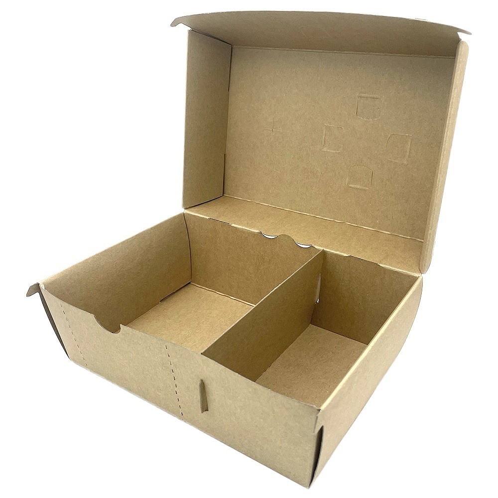 To trwały materiał, który zapobiega przenikaniu tłuszczu i chroni jedzenie przed zanieczyszczeniami z otoczenia. Pudełko na burgera jest podzielone przegrodą i możesz w nim łatwo przygotować burgera razem z frytkami. Nasze pudełko na burgera z przegrodą jest wyjątkowe, ponieważ ma na górnej części wycięcie, które można wcisnąć i przeciągnąć przez nie wykałaczkę, aby burger dobrze się trzymał. Pudełko Kraft z przegrodą oferujemy w rozmiarze 19 x 13 x 10 cm.