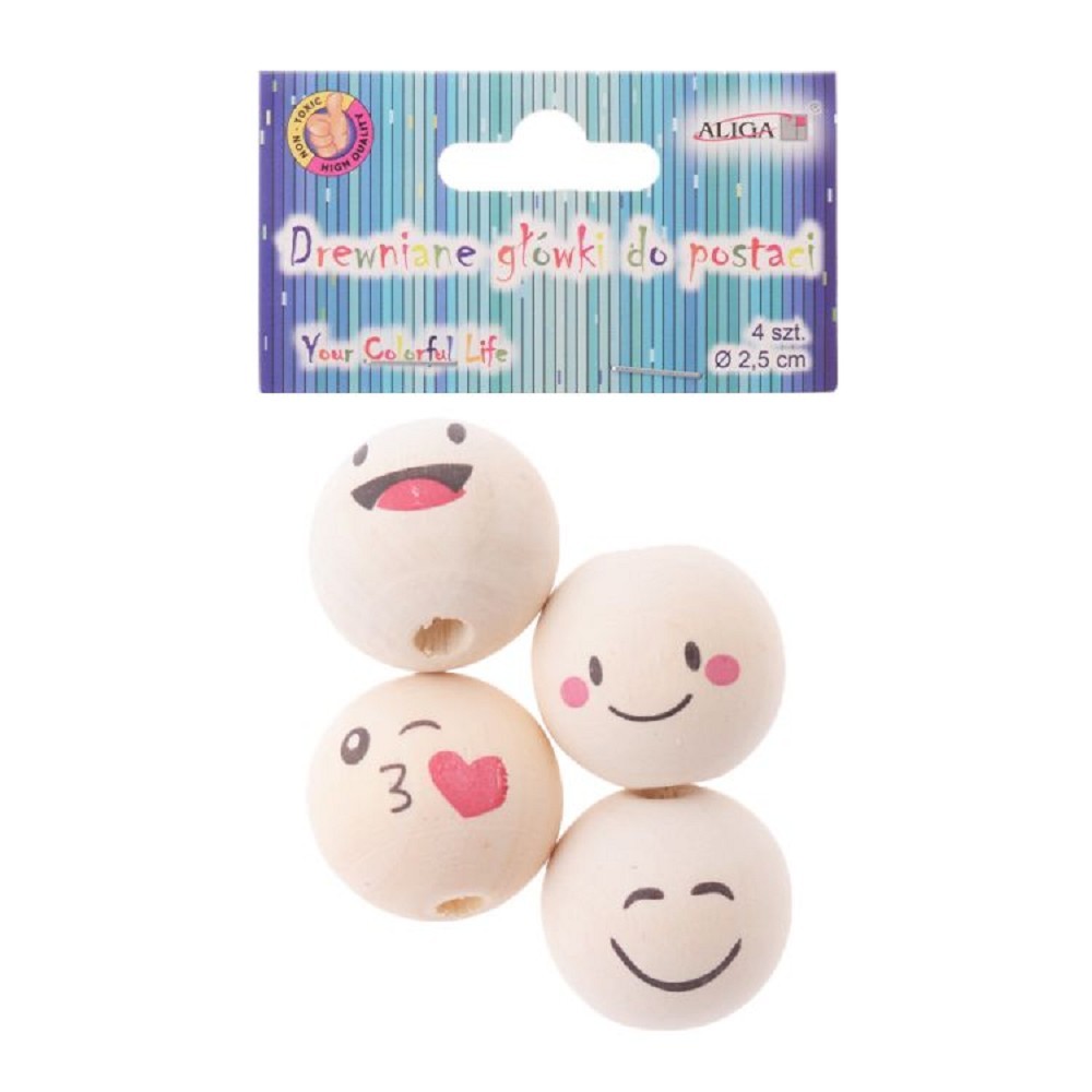 Korálky kulaté, dřevěné SMILEY - 4 ks