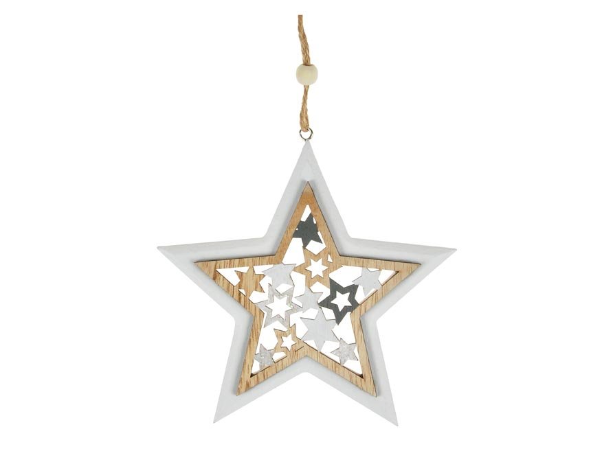 Dřevěná vánoční dekorace ve tvaru hvězdy se závěsem. Tato dekorace je opatřena očkem a provázkem s korálkem na zavěšení. Ideální na zavěšení do okna nebo jako vánoční ozdoba.Velikost: 130 mmUvedená cena je za 1 ks. przeczytaj całość