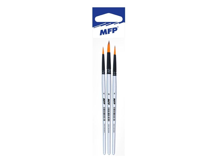 Zestaw 3 okrągłych pędzli z delikatnym włosiem syntetycznym ukształtowanym w szpic oraz drewnianą rączką. Dzięki włóknom syntetycznym ułatwiają rozprowadzanie farb i dobrze trzymają kształt. Są mniej podatne na uszkodzenia przez farby i rozcieczalniki niż pędzle naturalne. Łatwe w utrzymaniu czystości. Nadają się zarówno do zastosowań szkolnych, jak i do różnych technik malarskich. Idealne do malowania detali, wypełniania kolorami lub konturowania. Włosie zabezpieczone plastikową osłonką.