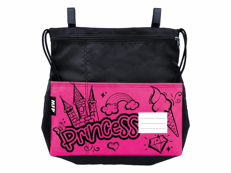 Kieszeń wyposażona jest w trzy pojemne przegrody: główna kieszeń na suwak zapewnia wystarczająco miejsca na większe przedmioty, a dwie przednie, otwarte kieszonki umożliwiają szybki dostęp do drobiazgów. Na przedniej stronie znajduje się przezroczysta kieszonka z metką, gdzie można włożyć imię, adres i telefon kontaktowy dziecka, co ułatwia identyfikację.