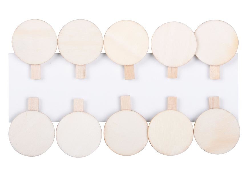 Drewniane, dekoracyjne klamerki w naturalnym brązowym kolorze z kółeczkiem. Nadają się do kreatywnego rękodzieła, do przypinania zdjęcia lub dokumentu. Wykonane ze sklejki.