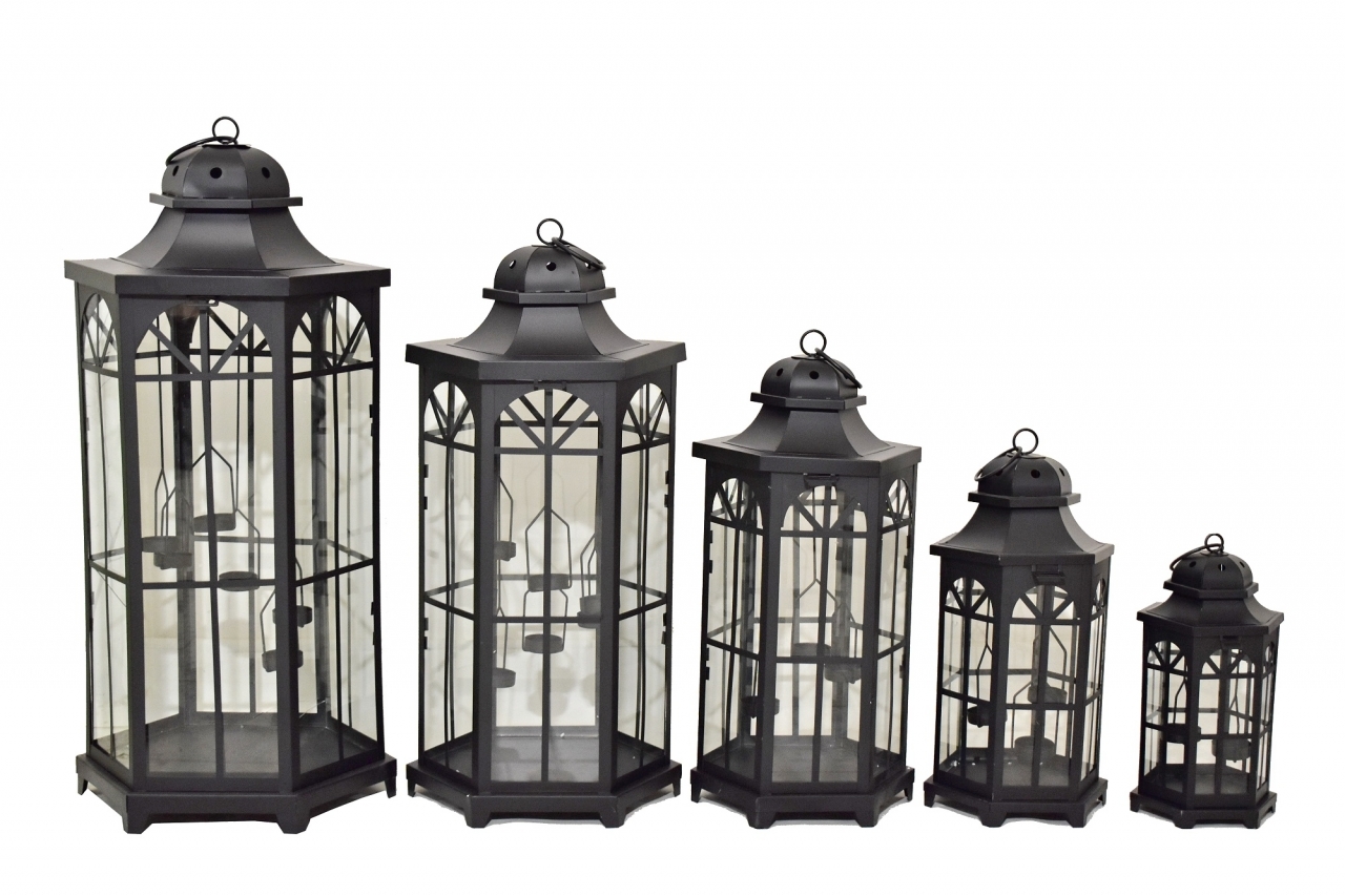 Sada 5 ks kovových luceren, uvnitř kovové háčky s kalíšky na čajové svíčky. Kalíčky jsou rozmístěné různě vysoko.Materiál: kov, skloBarva: černá s patinouRozměr:výška 70 cmprůměr 29 cmvýška 60 cmprůměr 25 cmvýška 50 cmprůměr 21 cmvýška 40 cmprůměr 17,5 cmvýška 30 cmprůměr 13,5 cm przeczytaj całość