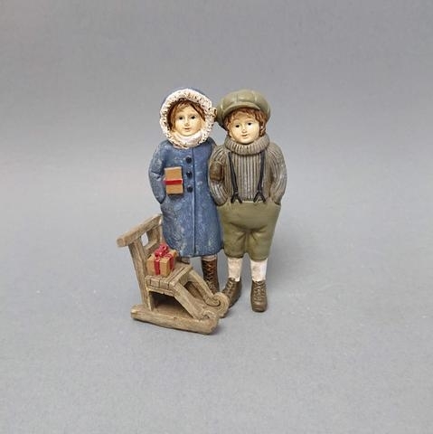Holka+kluk u sáněk s dárkem retro