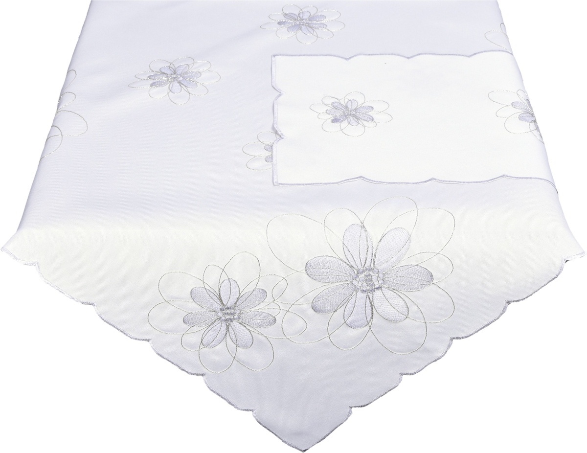 Ubrus celoroční, Stříbrno šedé květy vyšívané, bílý 40 x 90 cm