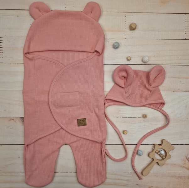 Univerzální zavinovačka, zavinovací deka + čepička, Medvídek, bavlna, růžová, 56/62; 56/62 (0-3m)