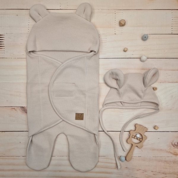 Univerzální zavinovačka, zavinovací deka + čepička, Medvídek, bavlna, béžová, 56/62; 56/62 (0-3m)