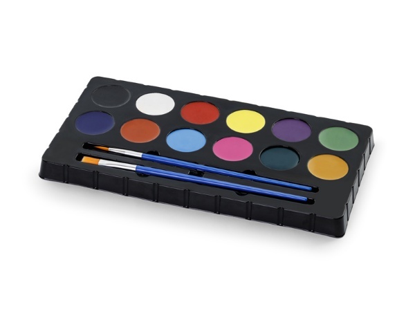 Bardzo wysokiej jakości farby do twarzy, rozcieńczalne wodą. Malowanie twarzy na Halloween, karnawał lub jako atrakcja na przyjęcie urodzinowe dla dzieci. Łatwo się nakładają, doskonale trzymają i nie rozmazują się. Łatwo zmywają się letnią wodą lub chusteczkami kosmetycznymi. W zestawie znajdują się dwa pędzelki. Opakowanie zawiera 12 kolorów i 2 pędzelki. Zestaw zawiera 12 kolorów po 4 gramach, 2 pędzelki (szeroki i cienki) oraz ilustrowaną instrukcję mieszania odcieni. Lista kolorów: jasnozielony, ciemnożółty, ciemnozielony, fioletowy, żółty, różowy, czerwony, niebieski, biały, brązowy, czarny, ciemnoniebieski.