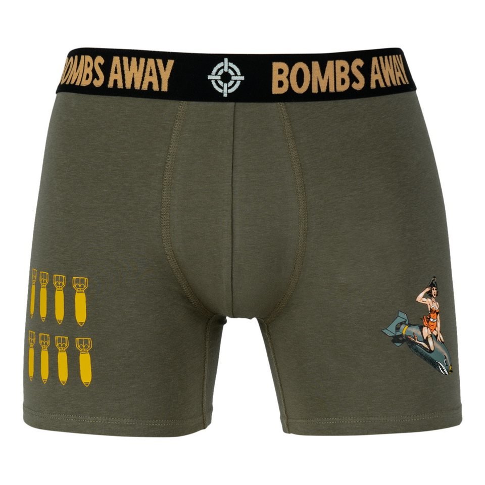 Zelené boxerky s měkký elastickým pasem, textovým potiskem BOMBS AWAY a dvěma obrázky na levém a pravém stehně. przeczytaj całość