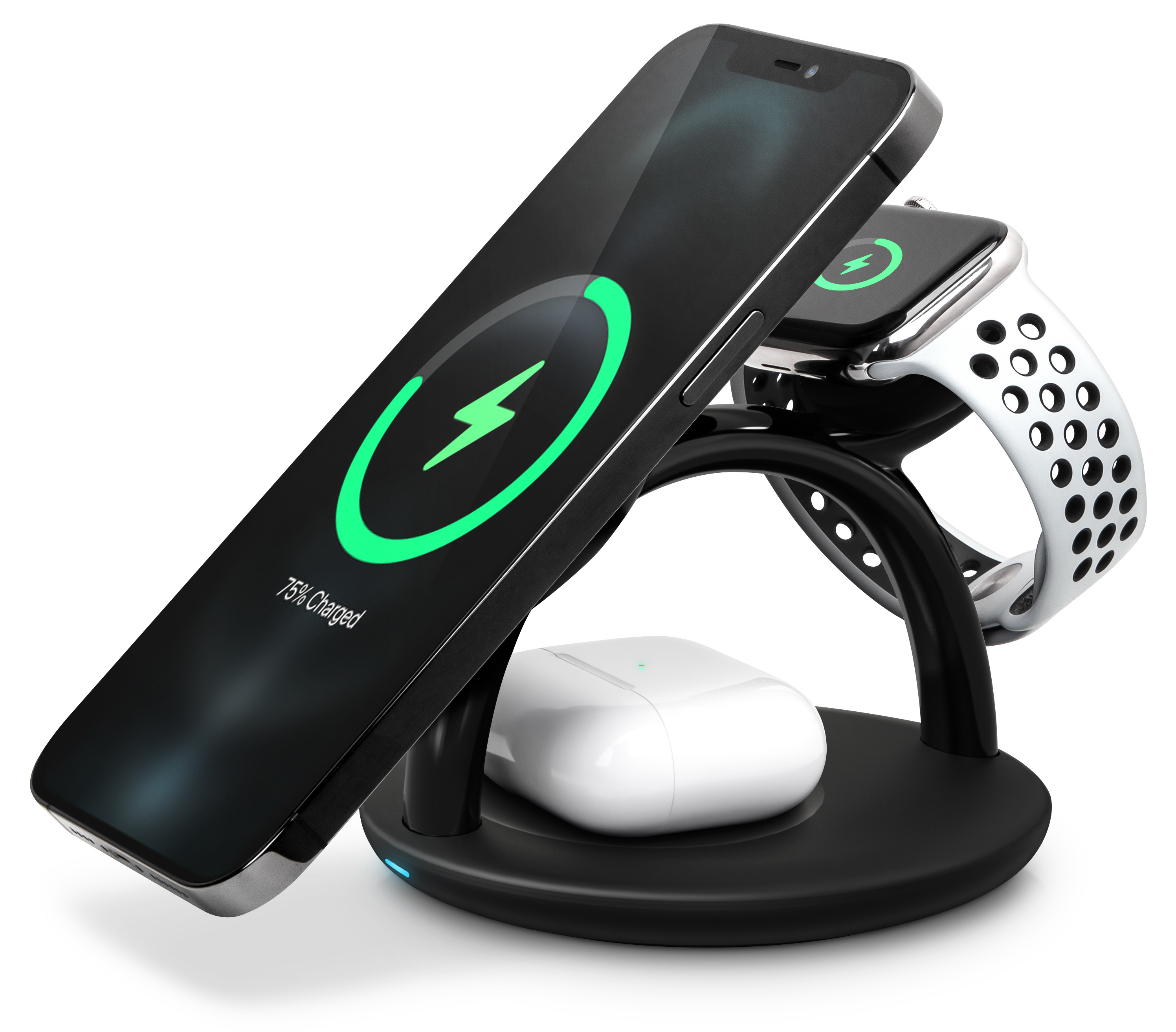 MultiCharge MagSafe 3w1 wykorzystuje technologię magnetycznego pierścienia MagSafe, by perfekcyjnie ustabilizować iPhone'a podczas ładowania i obsługuje szybkie ładowanie do 15 W. Dzięki temu oszczędzisz nawet połowę czasu ładowania w porównaniu ze standardowymi ładowarkami bezprzewodowymi. Dodatkowo jest kompatybilna ze wszystkimi telefonami obsługującymi MagSafe, Apple Watch oraz AirPods z ładowaniem Qi. Wystarczy położyć urządzenie na ładowarce, a energia zacznie płynąć.