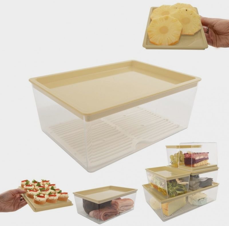 Dóza přehledně a hygienicky uskladní sýry, uzeniny, chlebíčky, ovoce, zeleninu, saláty a další potraviny v lednici i ve špajzu. Výhodou je vložená mřížka na dně dózy, která umožní potravinám "dýchat". Praktické víčko využijete také jako tácek k servírování. Při podávání např. šťavnatého ovoce...
