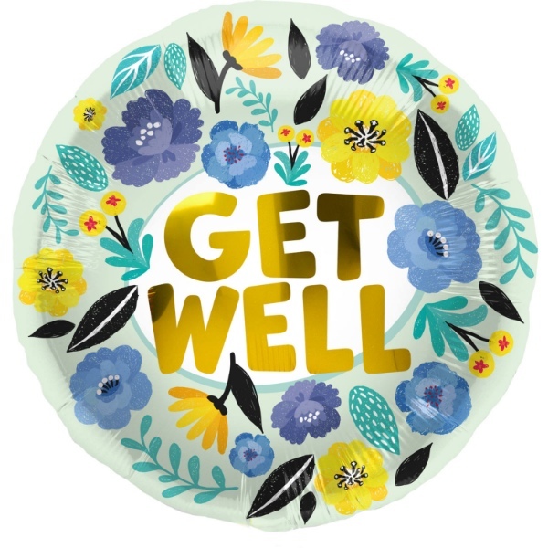 Foliový balonek s motivem květin a nápisem Get Well, který můžete použít například jako dekoraci při oslavě návratu kolegy po nemoci do práce nebo jako dárek při návštěvě do nemocnice.