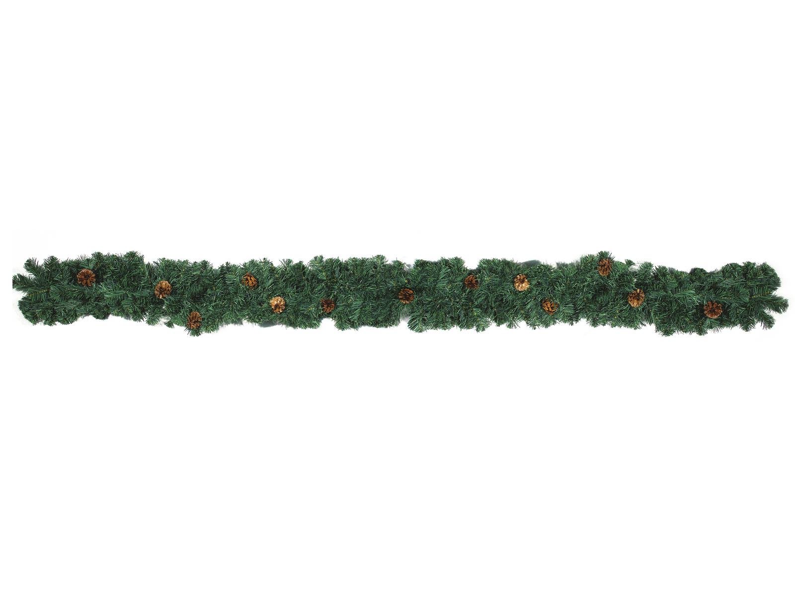 Umělá jedlová vánoční girlanda se šiškami. Délka dekorace 270 cm, průměr 20 cm, 312 drobných větviček posetých zelenými jehličkami z odolné plastové fólie LUVI, 24 umělých šišek k nerozeznání od živé předlohy. Uvnitř dekorace je zabudovaný ohebný drát, který umožňuje její tvarování a spojování...