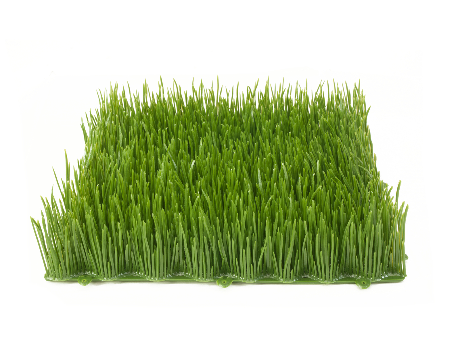 Wysokiej jakości sztuczna trawa wykonana z tworzywa sztucznego. Odporna na warunki atmosferyczne, nadaje się do montażu wewnątrz i na zewnątrz. Dostarczana w płytkach o wymiarach 25 x 25 cm, które łatwo się montuje i umożliwiają formowanie oraz pokrycie większej powierzchni. Pojedyncze źdźbła mają różną długość i jasnozielony kolor, maksymalna wysokość wynosi 7 cm. Dzięki temu dekoracja wiernie imituje żywy trawnik.