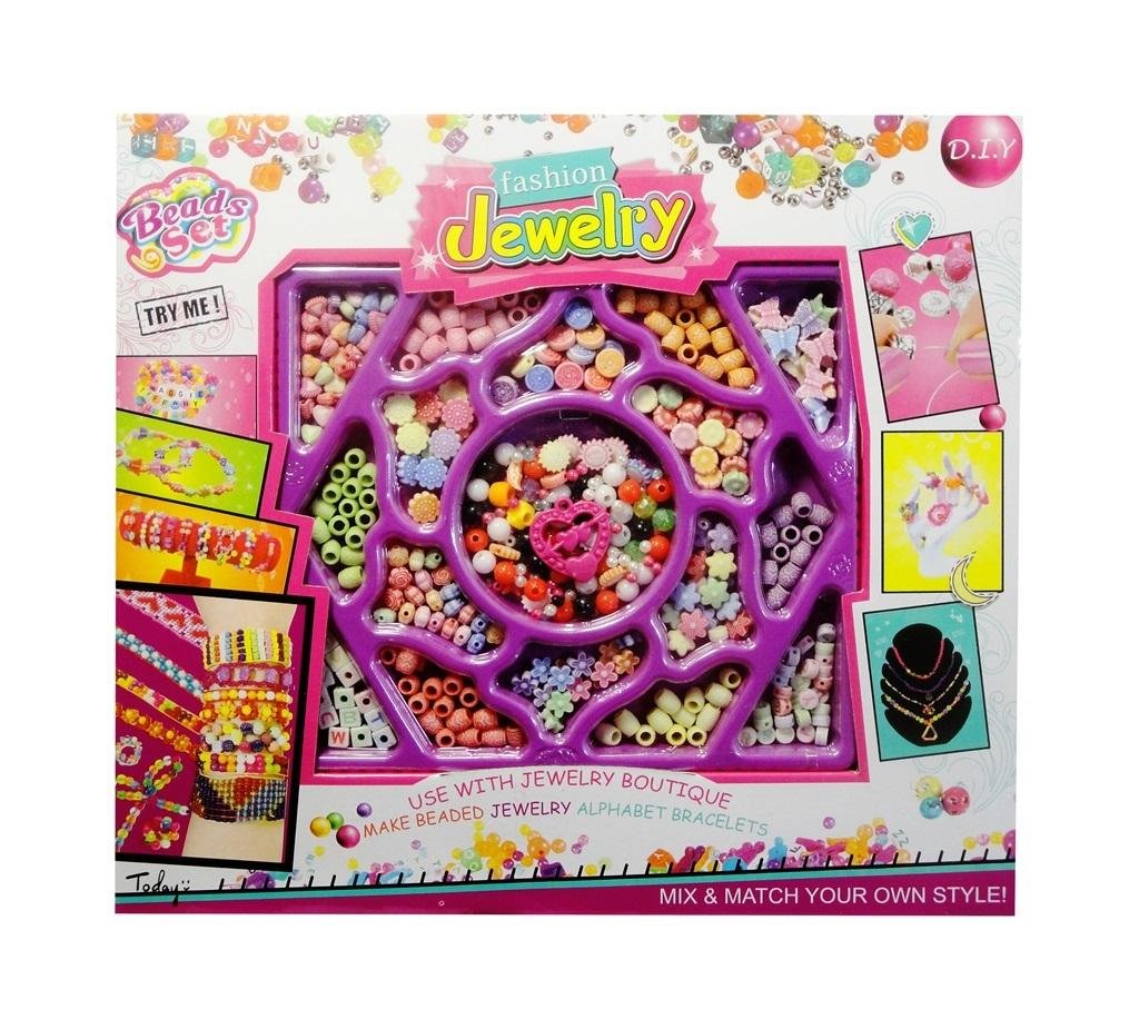 Koraliki wraz kolorową nicią, muliną, sznureczkiem do tworzenia unikatowych bransoletek. Koraliki w kształcie m. in.: serduszek, różyczek, stokrotek, motylków Produkt zapakowany w kartonową podstawkę z przezroczystym kloszem. Zabawka dla dzieci od 3 lat. Podane wymiary są wymiarami opakowania. przeczytaj całość