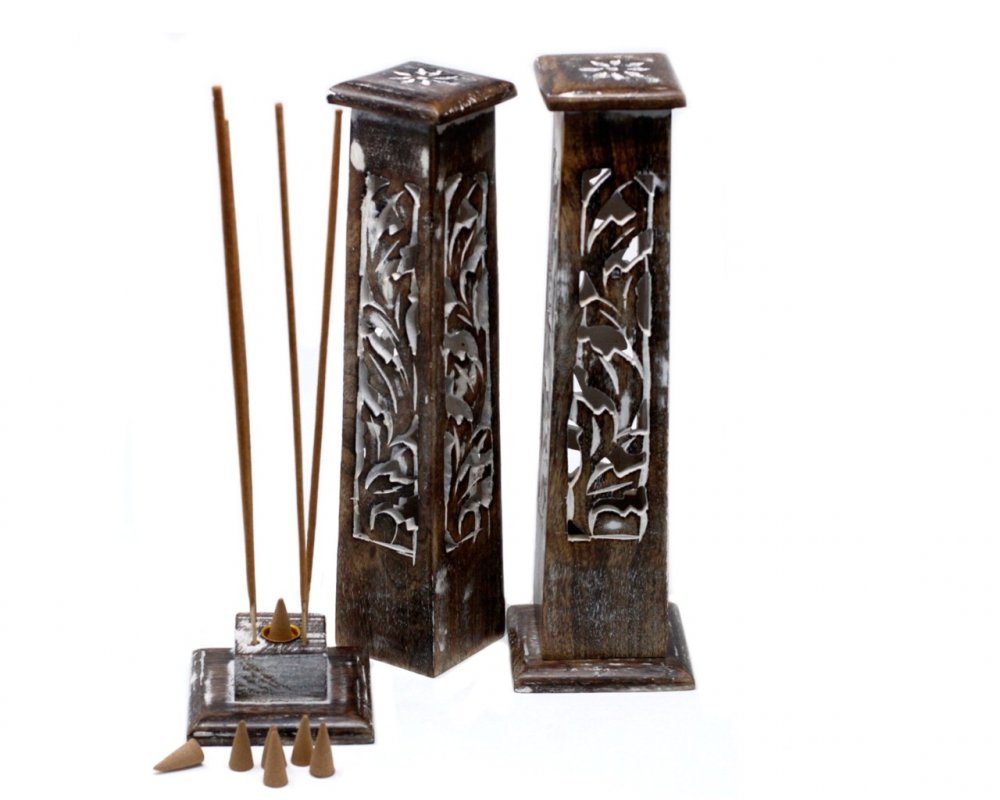 Tradycyjny drewniany stojak na kadzidełka w indyjskim wzorze. Produkt może nieznacznie różnić się od zdjęcia. Każdy egzemplarz jest unikatowy, drobne niedoskonałości nie stanowią wady.