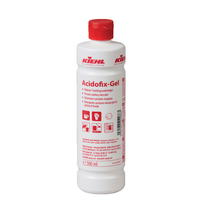 Acidofix GEL - Silný viskózní gel pro odstranění vodního a močového kamene. Odstraní zápach z WC a kolem toalet.Silný kyselý odvápňovač pro odstranění špatně rozpustných minerálních nečistot. Odstraňuje zbytky vodního kamene. Díky gelové formě dobře čistí na svislých plochách. Lze ředit a použít...
