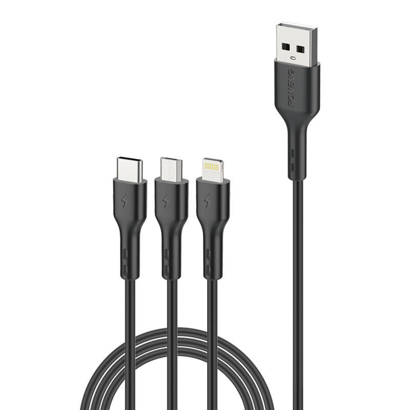 Foneng X36 kabel USB 3v1 (černý)Zapomeňte na nutnost kupovat několik kabelů a spolehněte se na praktické řešení od společnosti Foneng. Kabel X36 je vybaven konektory USB na USB-C, micro USB a Lightning, takže můžete obnovit napájení několika různých zařízení najednou s proudem 2,4...