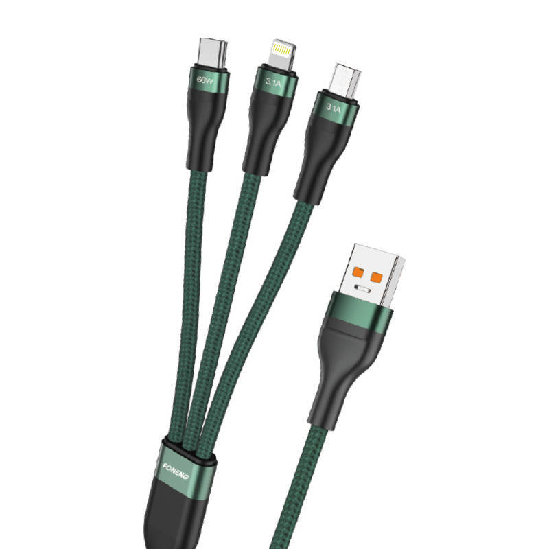 Foneng X78 kabel 3v1 USB na USB-C / Lightning / Micro USB, 66 W, 1,2 m (zelený)
