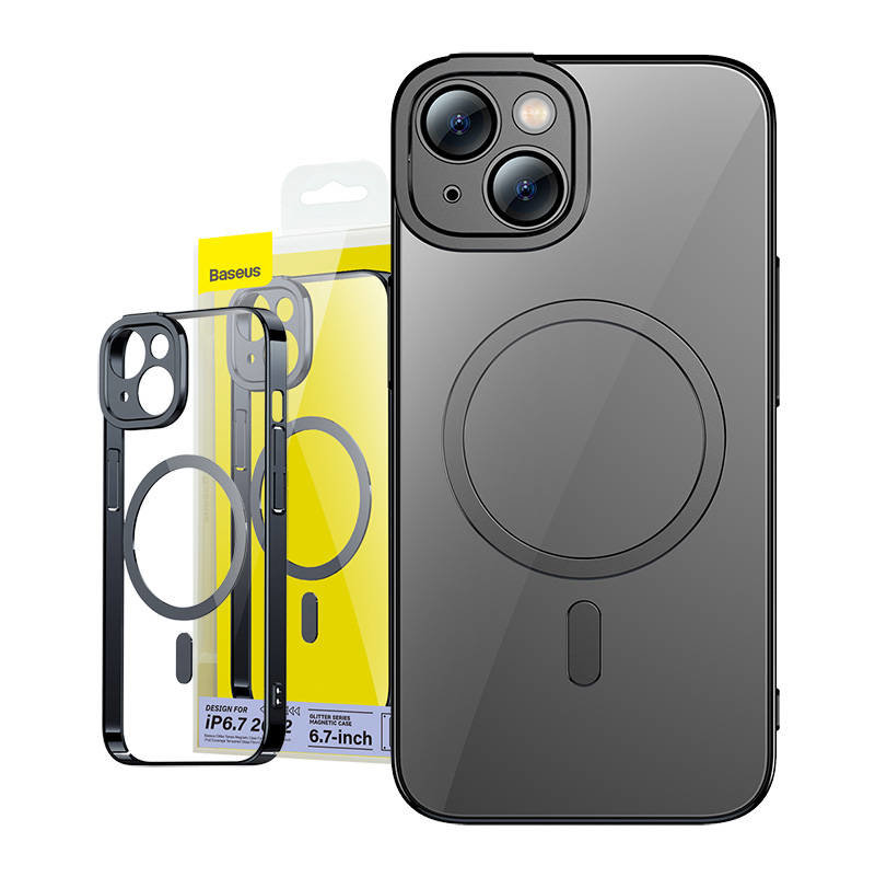 Baseus Glitter Transparentní magnetický kryt a sada tvrzeného skla pro iPhone 14 Plus (černý)