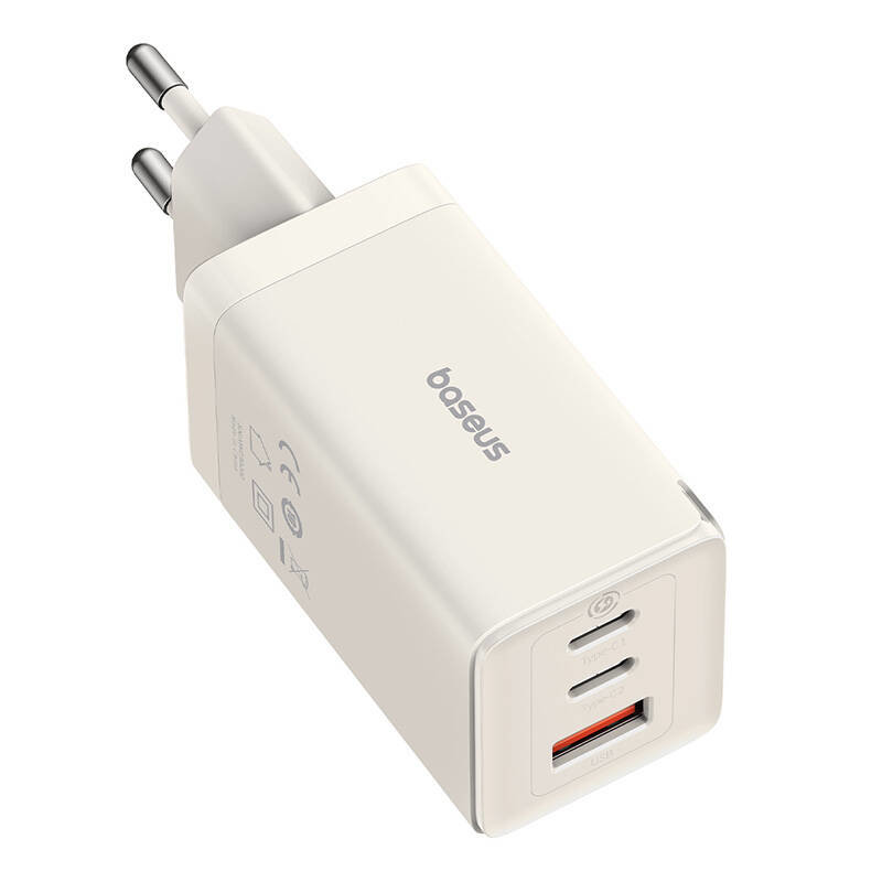Wall charger Baseus GaN5 2x USB-C + USB, 65W + cable 1m (white)
