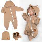 Bavlněný oteplený overálek s kapucí, rukavičky, botky, 3D sada Nature - taupe, vel. 62; 62 (2-3m)